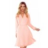 Vzdušné dámské šaty vhodné do letních dní. Nádherné broskvové šaty, které mají dlouhý rukáv, který je ukončen gumičkou. Dekolt je tvořen jako zavinovací a tím je vytvořen výstřih do V. V pase je guma, která se skvěle přizpůsobí jakékoliv postavě, sukně je skládaná. Šaty můžete doplnit i páskem v úzkém provedení. Oblečte si tyto šaty na jakoukoliv společenskou událost a určitě budete středem pozornosti.